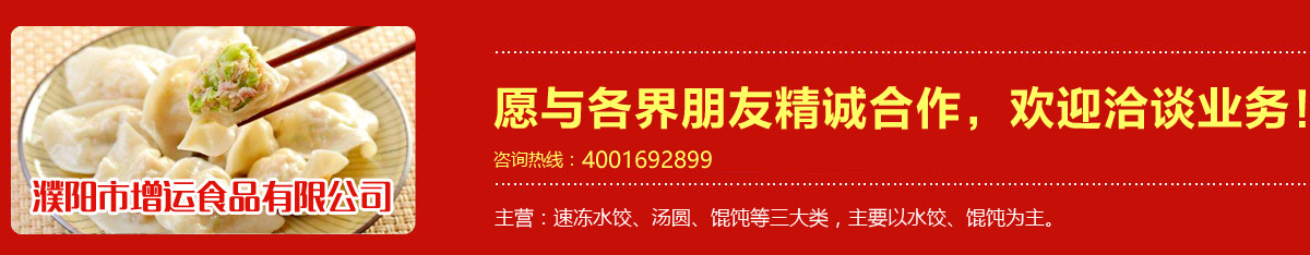 河南·濮陽增運食品有限公司位于龍的故鄉--濮陽,是一家生產速凍米面食品的專業公司,著力打造“增運”品牌,產品主要有速凍水餃、湯圓、餛飩等三大類,主要以水餃、餛飩為主。公司擁有兩個先進加工車間,一個凍品加工車間,能滿足各種速凍產品的加工需求。